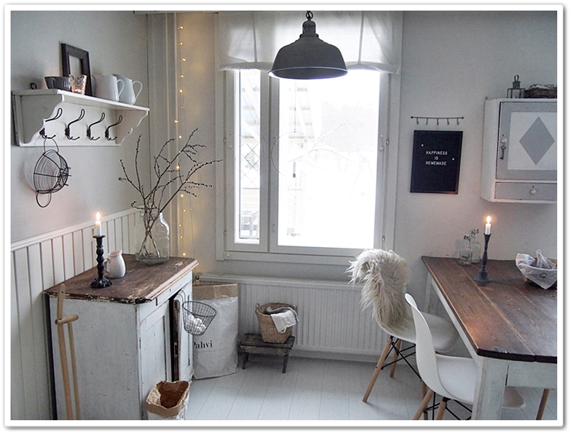 Minua kun toisinaan harmittaa tuo pieni keittiö ja ahtaanpuoleinen ruokailutila, jossa ei oikeastaan muutoksiin ole mitään mahdollisuuksia! Mutta syttyihän se lamppu viimeinkin ja päätin siirtää pöytää n. metrin eteenpäin entisen patakaapin paikalle...ja TADAA...siinähän se :D