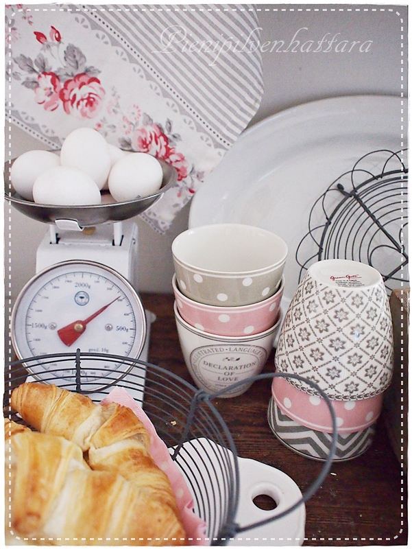 Lauantain kaupunkireissulla hypistelin latteja käsissäni, mutta ostinkin vain kauniin keväisen GG:n keittiöpyyhkeen, sekä rautalankakorin. Latteja on kuitenkin kerääntynyt kotiin jo aikalailla. Jäin tosin miettimään, että ehkäpä voisin muutaman korvallisen kahvikupin myös lisätä kokoelmiini.
