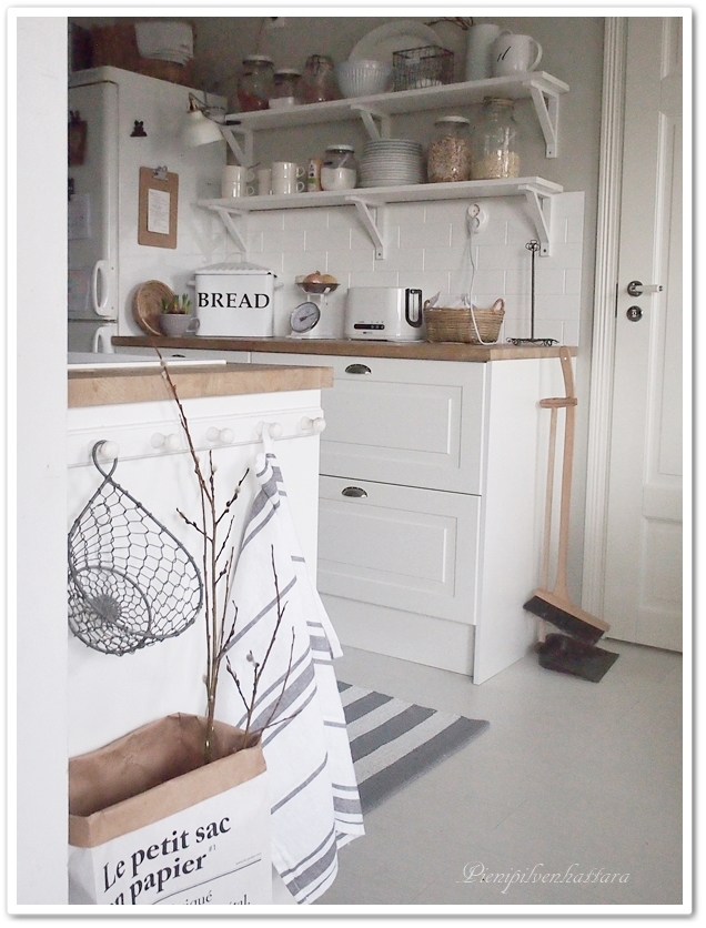 Yksi pikkuostos tuli vielä lopuksi tehtyä Naantalin paikallisesta sisustusliikkeestä, sillä olin pitkään haaveillut tuollaisesta Le Petit-paperikassista, ja sen sattumalta löysinkin keittiöömme. Siihen saa kätevästi kasattua kierrätykseen menevää kartonkijätettä, vaikka nyt sinne olikin livahtanut pari pajunoksaa sekaan :)