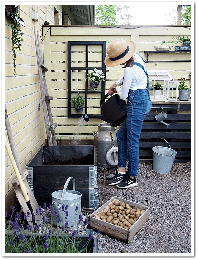 Nyt vain kastellaan silloin tällöin ja odotellaan innolla varsien kehittymistä. Perunat pitäisi olla valmiita syötäviksi jo 8:n viikon kuluttua ja perunan lehdetkin näyttävät mielestäni kasvaessaan todella kauniilta puutarhassa, joten pidetään peukkuja ja varpaita pystyssä, että onnistutaan tässä projektissa.